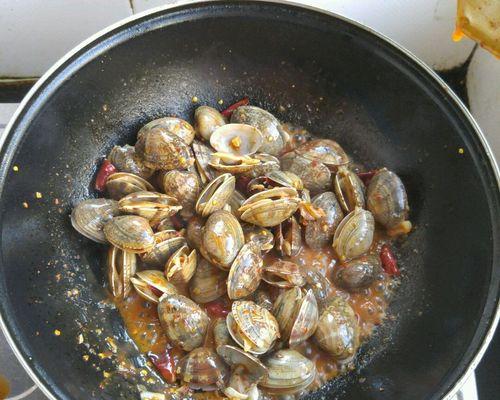 在加入调料和葱花、辣椒后,需要将锅中的黄蚬子翻炒均匀,以保证每一只蚬子都能充分吸收到调料和香味。