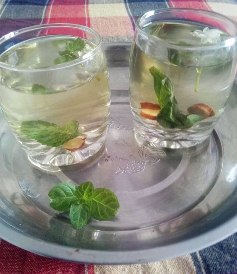 1:薄荷叶摘下先用清水洗净尘土,放进水杯用开水泡出香气