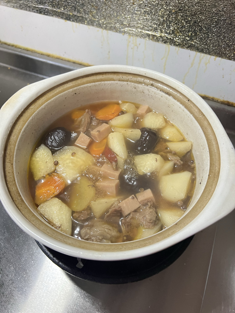 4:萝卜香菇姜一起放汤锅里,加水差不多没过食材或者没过吧,要不然炖久了水变少。。