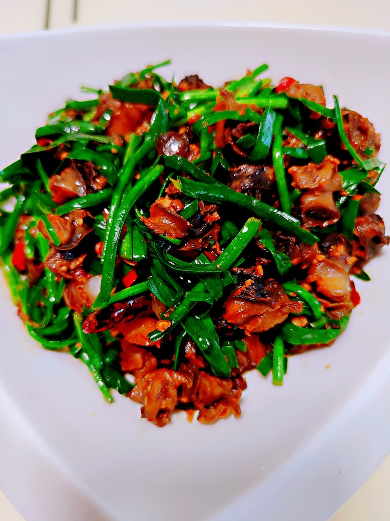 家常韭菜炒螺丝,一道充满烟火气的经典小炒。碧绿的韭菜与褐红的螺丝肉在热油中相逢,瞬间激发出诱人的香气。韭菜的辛香清爽恰好中和了螺丝的浓郁,大火快炒锁住鲜嫩汁水,咸鲜微辣的滋味层层递进,是佐餐下饭的绝佳选择。这道菜不仅承载着家常的温暖记忆,更以简单的食材组合,诠释了中式小炒“锅气”与“鲜香”的精髓。