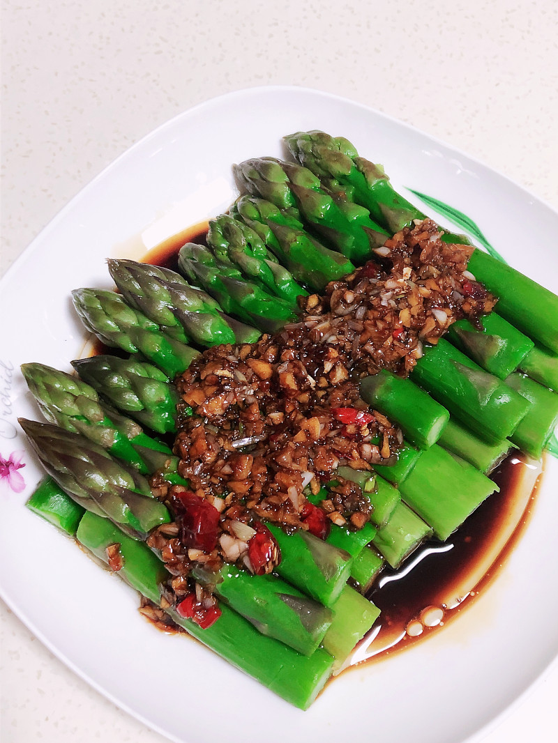 4:少油爆香蒜茸后,加入蚝油、生抽淋上摆好盘的芦笋上即可食用。