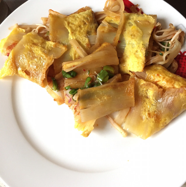 2:加热到鸡蛋稍微凝固,用铲子和筷子辅助把冷面皮翻面。改小火。