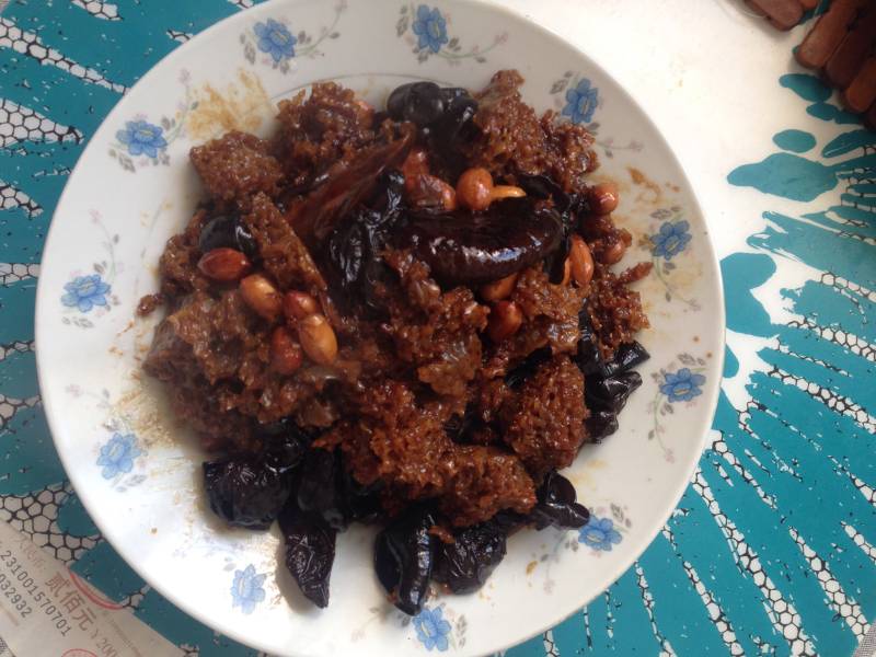 洗好的烤麸不要挤干水分,沥下水分就可以了,整个菜不加水。这道菜一定要炒干水分至油出才好吃。花生米可以不加,加点黄花菜,因为儿子不喜欢吃黄花菜所以就