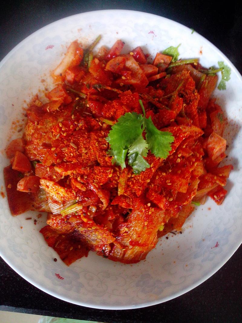 4:涂上辣酱,撒上葱花、香菜、白糖、孜然、白芝麻,醋,每一项可根据个人口味加入。