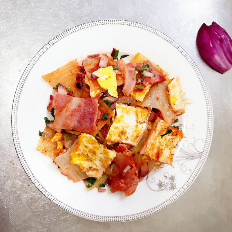7:在冷面块上撒上炒好的洋葱碎和培根,香菜碎。倒些调好的番茄酱下去。不用翻面,出锅时把鸡蛋那面朝上就好了。