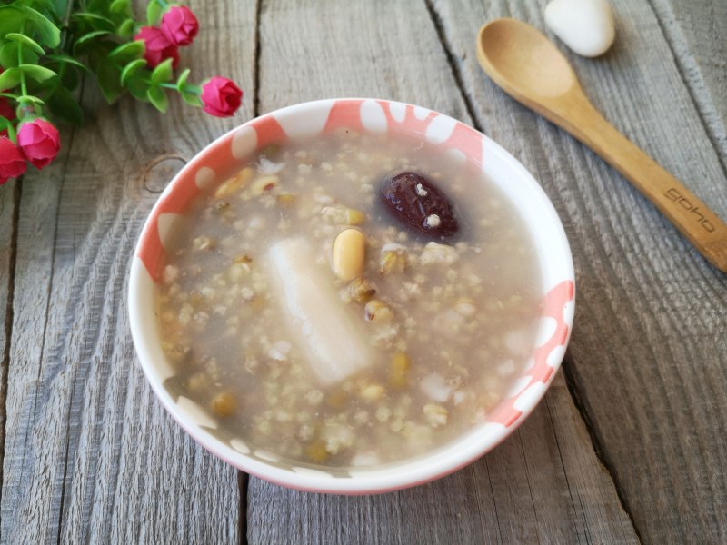 小米40克;绿豆20克;山药90克;燕麦20克;黄豆20克;红枣9个;