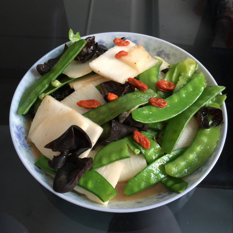 2:烧热油后,放入山药,煎豆,木耳炒几分钟后,加入料酒和盐。