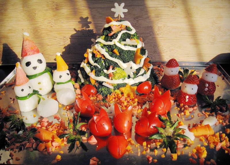 9:白萝卜做出雪人身形,圣诞小人的脸,其他萝卜根据需要做成喜欢的形状挂圣诞树上。