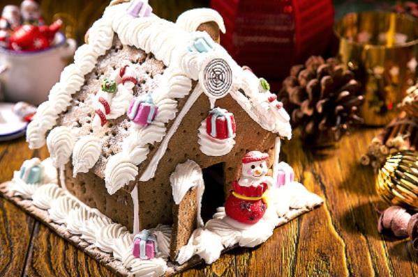 16:趁“白雪”蛋白糖霜还未干硬,把各式缤纷的糖果都装点到“屋子”上吧,充满童话色彩的圣诞姜饼屋完成了~
