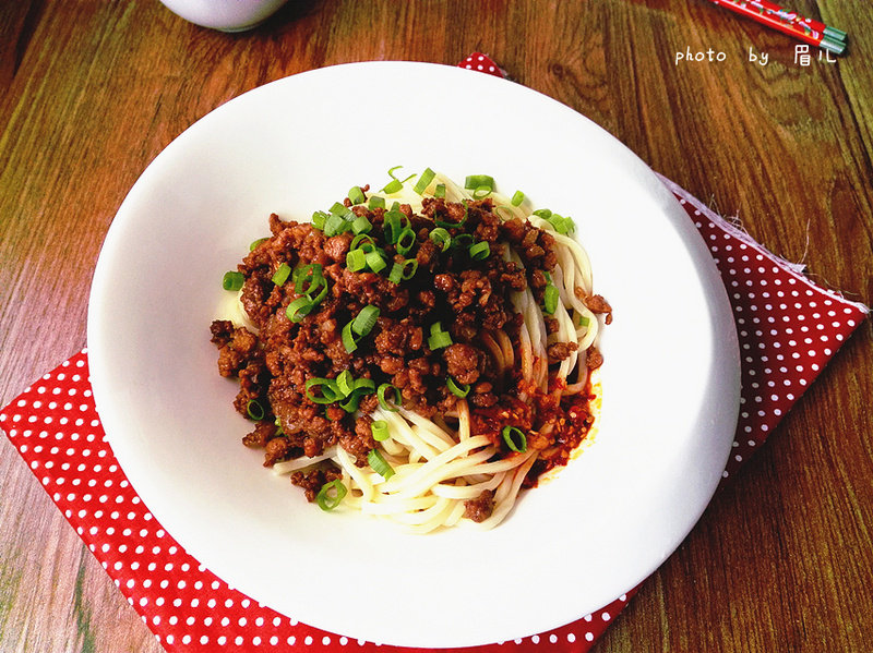 8:将面条甩干水分,放入大碗中,倒入调料汁,加入炒好的臊子,撒入小葱,拌匀即可。