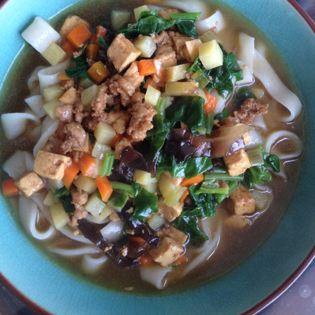 挂面适量;青椒1个;土豆1个;三文冶适量;黄花适量;冬瓜适量;葱适量;韭菜适量;炒熟猪肉适量;香菜适量;香茹适量;豆腐适量;胡萝卜适量;