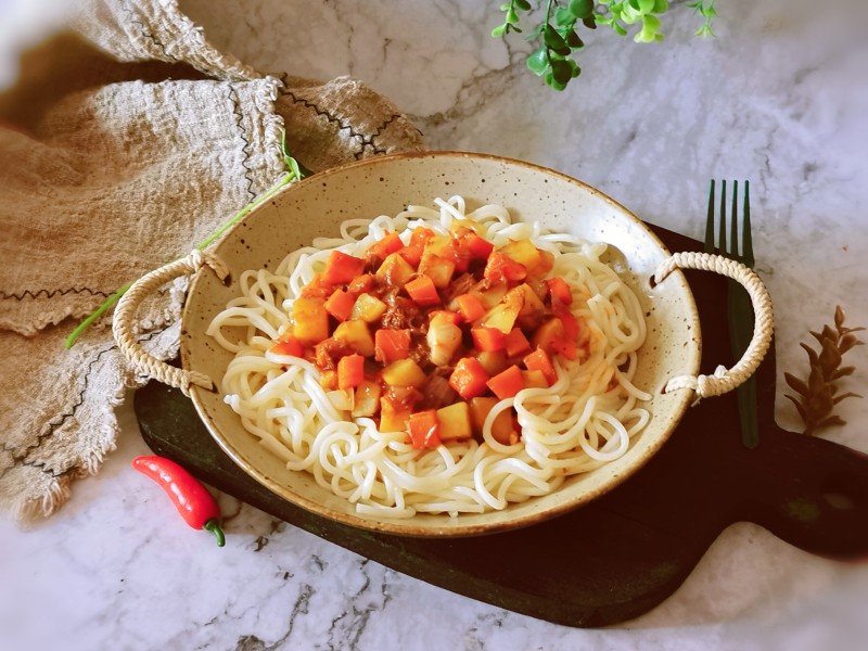 面条2人份;卤牛肉160克;番茄2个;胡萝卜1个;洋葱半个;土豆300克;