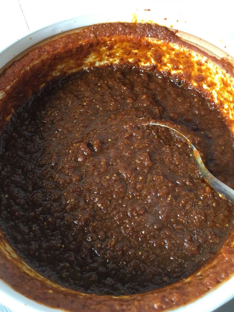 8:待膏体变得浓稠时转小火继续熬煮,要不断翻动,以免糊锅。冬天做菜,拍照弄不好就是雾气腾腾的。