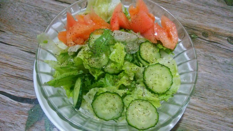 2:黄瓜切薄片,西红柿切块,圆生菜和苦菊撕小片