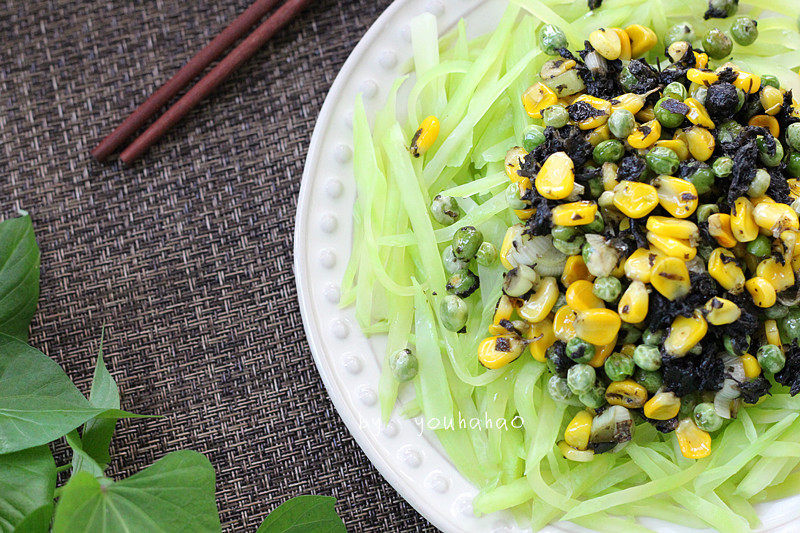 10:把炒匀的蔬菜放到莴笋丝上面,像意面一样;