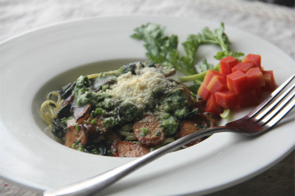1:意面1把(80g),蘑菇(王平菇,糙皮侧耳菇,猴头菇,香菇等)100g,大蒜5瓣(25g),青椒1/2个,食用油4大勺