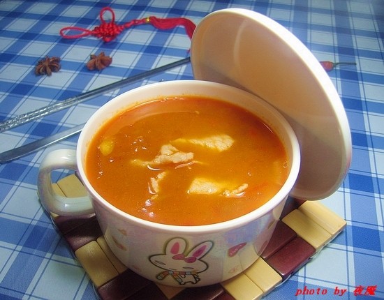 Ps:1、一个人份的汤,用了一个番茄,一调羹亨氏番茄酱和半调羹糖。如果人多则材料和调料也要适当增加。2、番茄我是偷懒,没有去皮。3、加入葱姜是为了去腥增香,此外除了料酒和番茄酱,没有放其他什么调料,这样可以让汤色红亮。4、收汁到汤汁浓厚才好喝。那么,明天继续去演播室吧,累死人的节奏。番茄肉片汤。