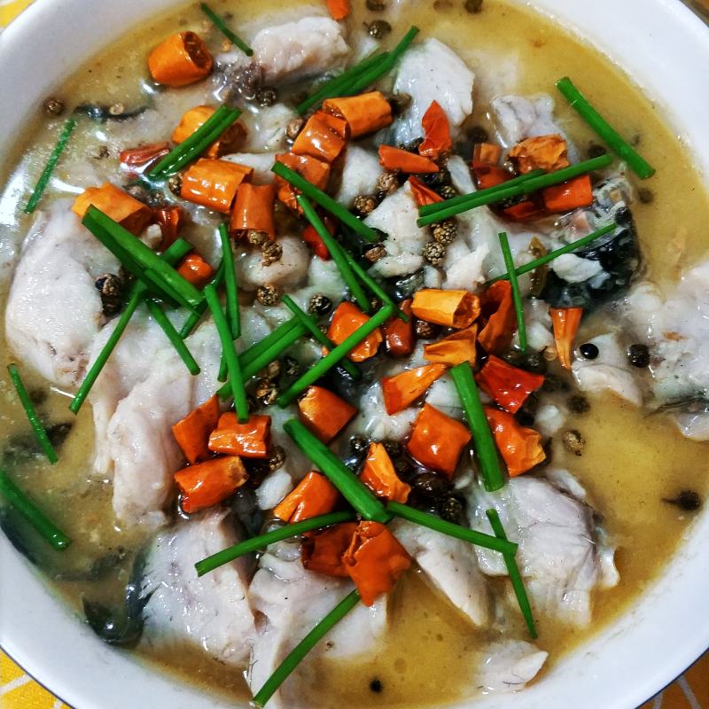 9:把剩下的鱼汤倒入盛满鱼片鱼骨的汤碗中,上面撒上剩余的干辣椒和花椒,爱吃蒜的,可以再撒上蒜末,最后将热油浇在辣椒上。
