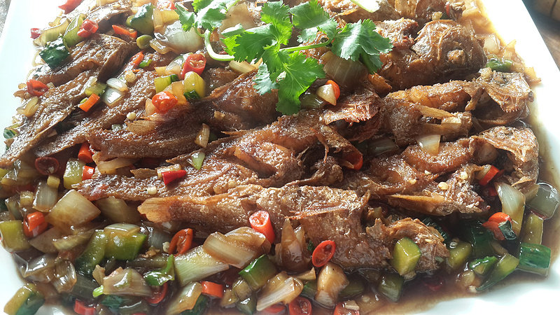 7:煎好后把剩下的姜放进去再淋入适量酱油耗油料酒翻炒一遍这样可以很好去一下腥味我差点把辣椒先放进去了