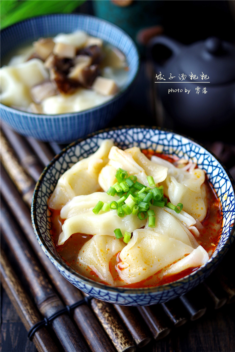 8:饺子汤粑粑煮熟后,捞出,放进第3步,第7步的调料碗里。红汤碗里浇入适量煮汤粑粑的汤汁,再撒入适量葱花,白汤碗里调入适量盐、鸡粉即可。