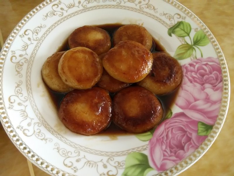 5:煎好后,放入白砂糖炒几下,加进适量水煨着,再加进红糖,待汤汁渐渐收浓,颜色红亮时,加入蜂蜜,出锅装盘。