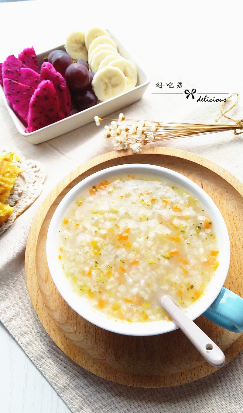 可以放入少许煮熟的鸡肉,就成了蔬菜鸡肉粥啦~
