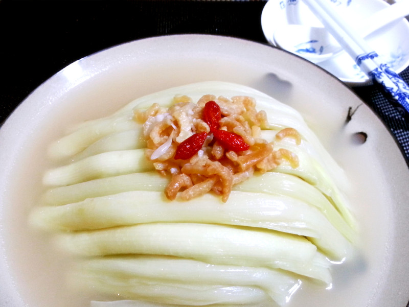 蒲菜的选料很重要,很多地方都有蒲菜,但是不是所有蒲菜口感都相同的。新鲜蒲菜要去除老蒲,若是真空包装好的蒲菜稍微清洗下就可以了。干虾仁提前用清水清洗浸泡。