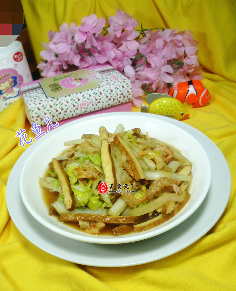 6:接着,合入切好的香干和泡好的开洋翻炒一下。