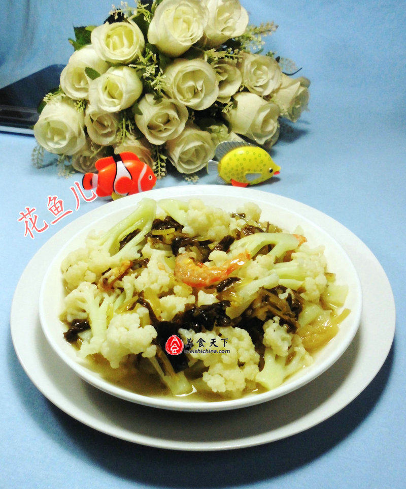 1:食材:花菜(已洗净)、雪菜、开洋(已泡)