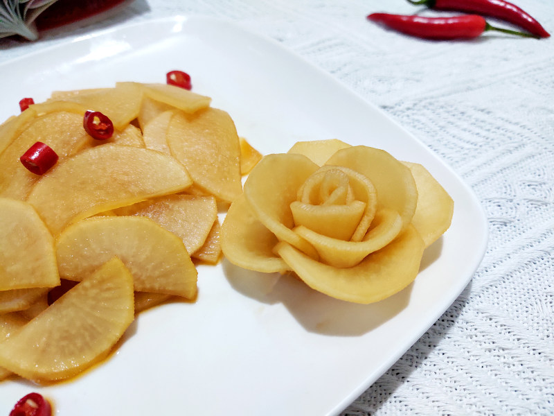 7:做好的酸甜红皮萝卜,酸酸甜甜,开胃好吃,颜色粉白嫩红,特别好看。