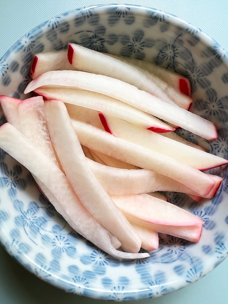 2:水萝卜切成长条,尽量粗细一致,这样一来好看,二来入味时间一致。