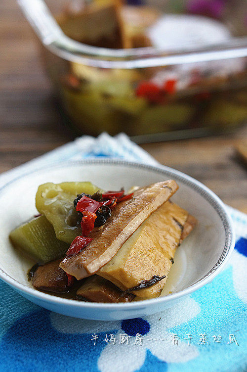 1:备料丝瓜,豆干,剁椒,橄榄菜。