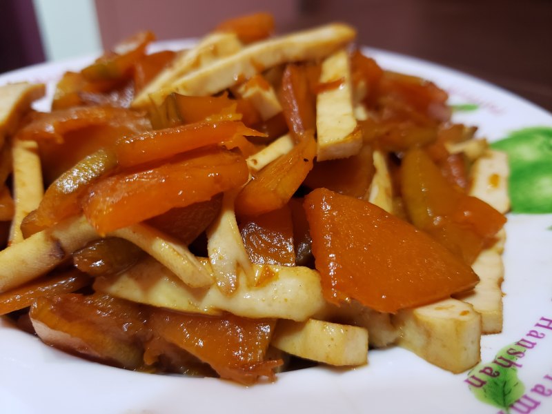 4:锅烧热放少许油,倒入南瓜加少许盐和生抽调味,翻炒几下,再倒入豆干,翻炒一下即可。