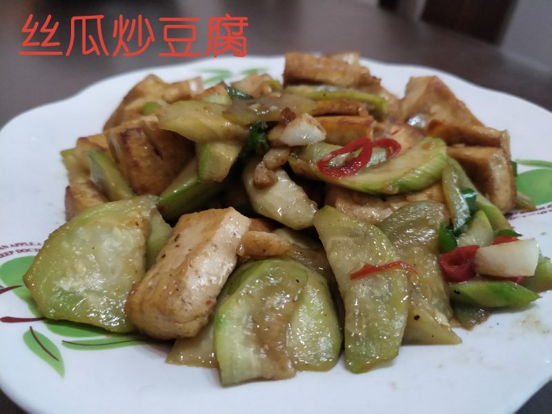 豆干适量;丝瓜半个;猪肉适量;青红辣椒各一个;大蒜头适量;葱适量;