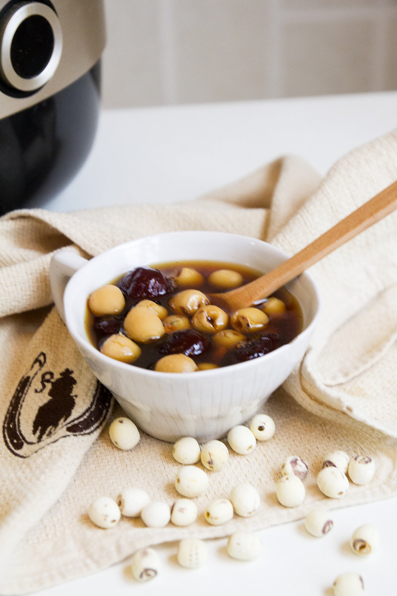 1:准备好食材,银耳要提前泡好,红枣洗净,莲子提前几个小时泡好,中间的心拿出来,否则会苦
