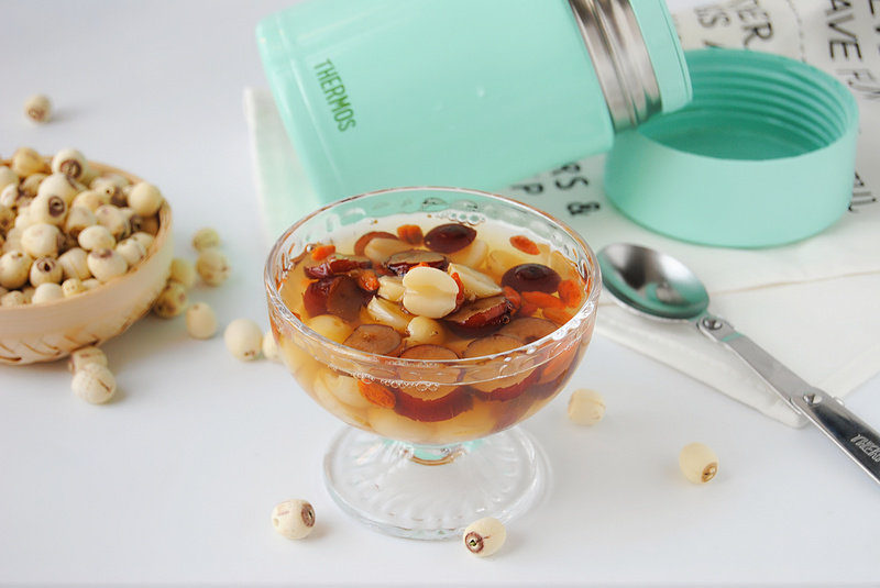 银耳1块;莲子2勺;百合1勺;花生2勺;红豆2勺;糯米2勺;红枣4个;