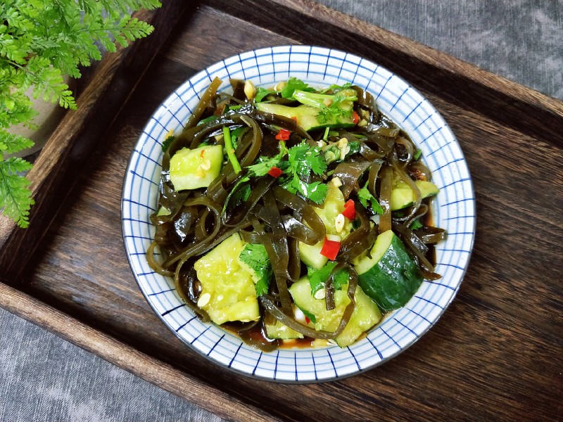 7:海带捞起放凉后放入黄瓜盘内,切点香菜。