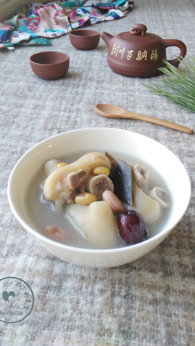 2:先将龙骨飞水后,放沙锅里加黄豆慢火煲二小时。