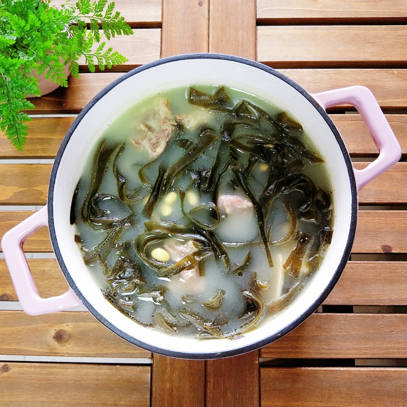 1:猪骨,海带泡软后切丝,泡发好的黄豆。