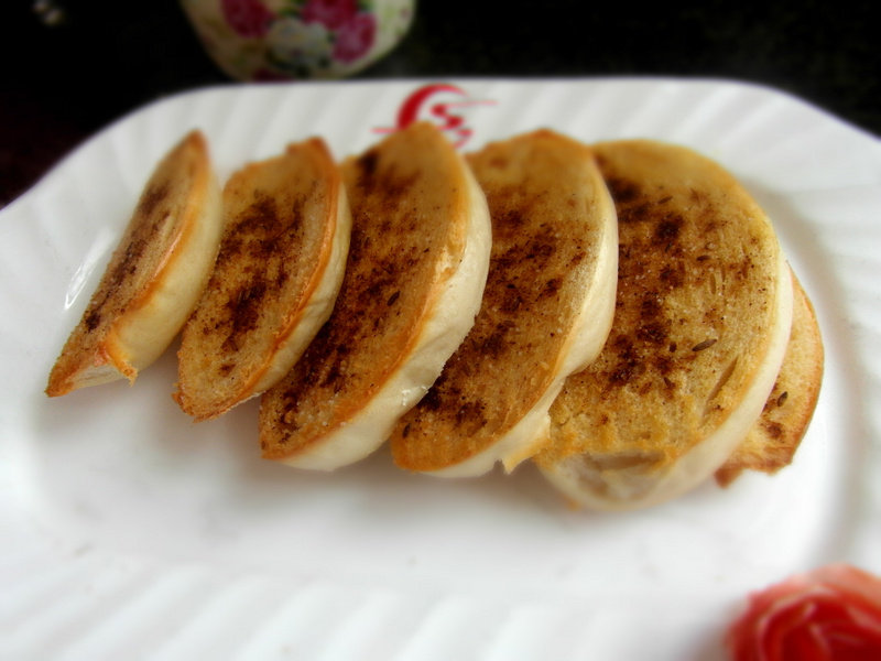 6:电饼铛均匀抹一层油,放入馒头片,煎至两面金黄就可以了。
