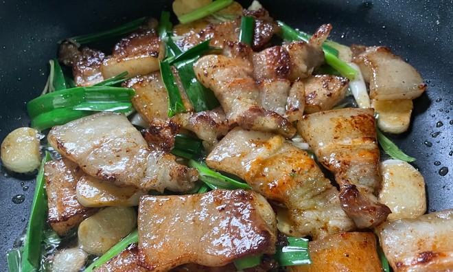 将切好的五花肉放入锅中翻炒,直到变色。加入葱姜蒜末和适量的盐,继续翻炒至五花肉出油。