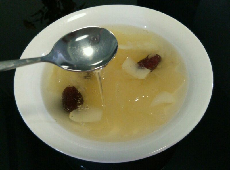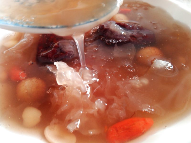 4:待桃胶、银耳煮至软滑,水浓稠后投入冰糖
