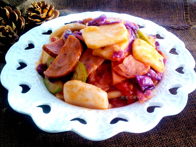 火腿肠60克;紫甘蓝20克;盐2克;鸡精粉2克;