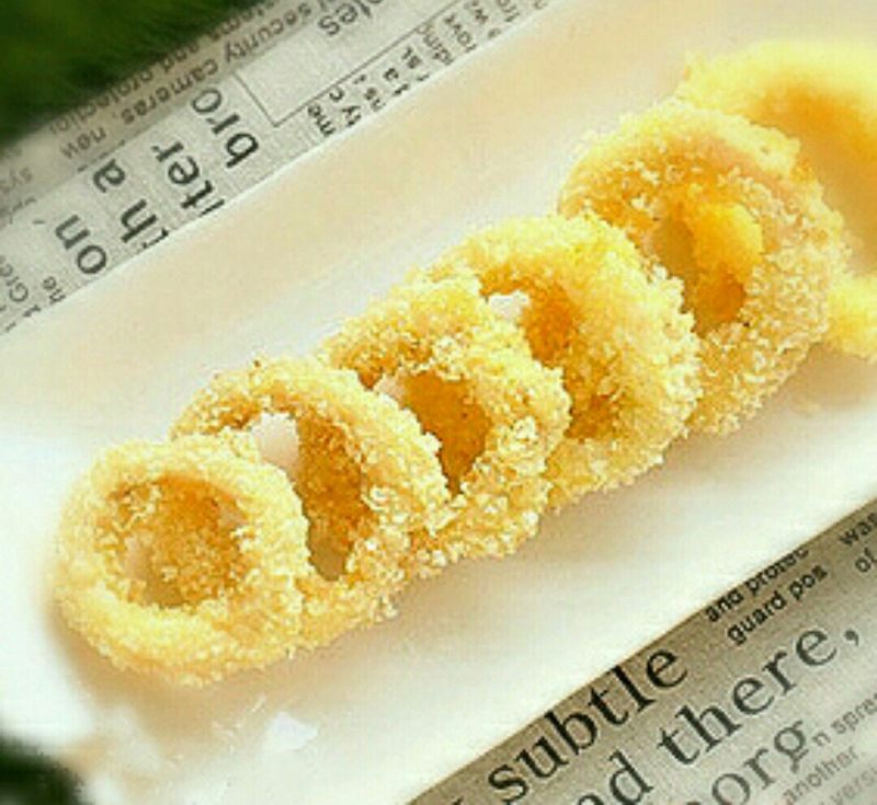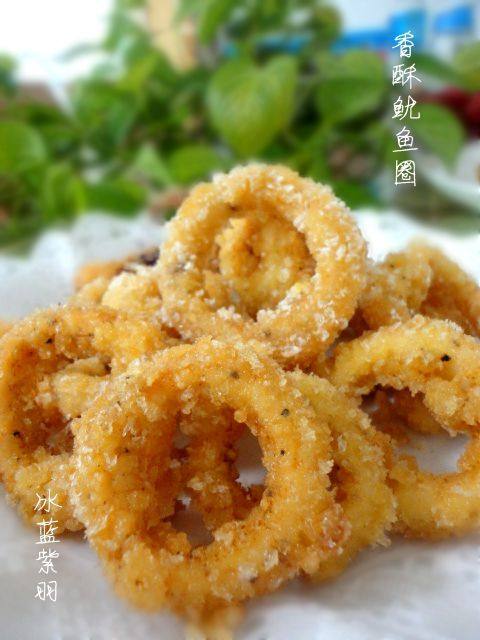 5:油热六成炸制做好的鱿鱼圈,炸到金黄色就可以了!
