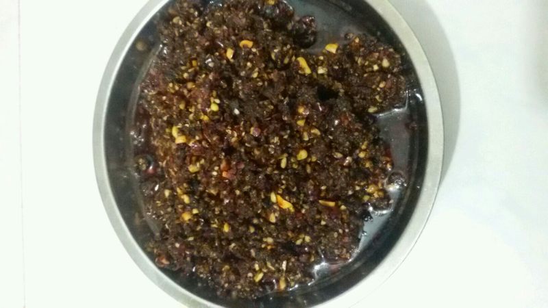 9:将压碎的豆豉放到锅里炒香,然后放入擀碎的辣椒碎翻炒一会,再放入花生碎和熟芝麻炒,再加一些辣椒粉炒匀,放少量的盐(因为豆豉本身很咸),生抽和白糖,加少量水,煮开一会后用水淀粉勾芡一下炒到有些粘稠,出红油就可以关火了。