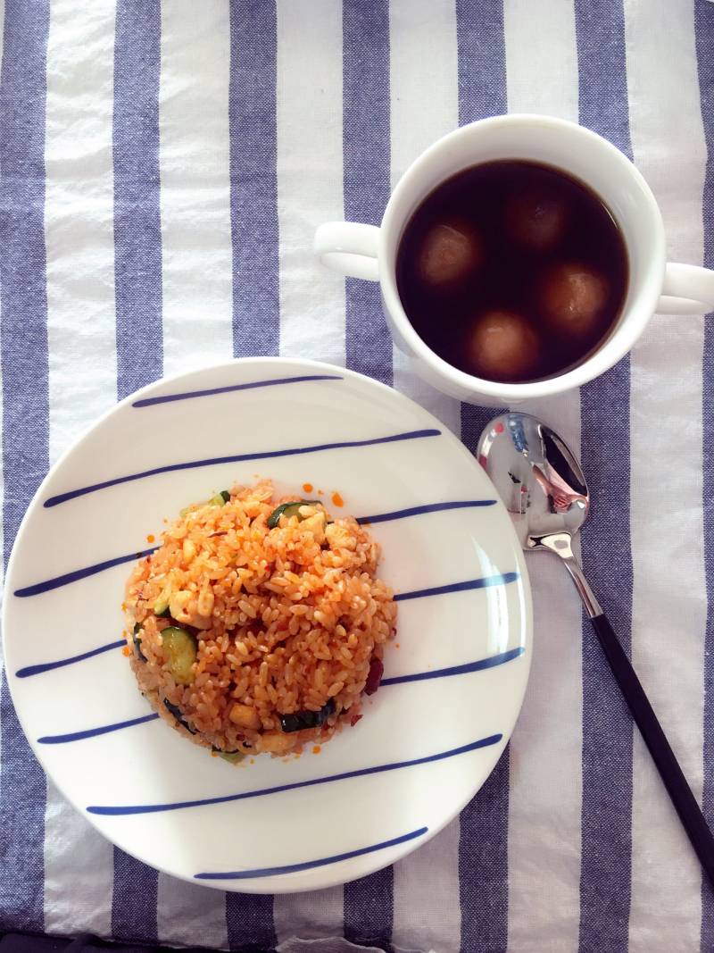 2:油锅里炒熟鸡脯肉,然后倒入米饭,翻炒,加黄瓜,老干妈,生抽,盐,再翻炒至全部米粒颜色均匀,加麻油起锅即可……