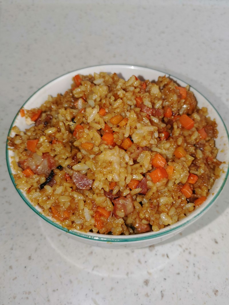 6:放入米饭,炒匀,倒入调好的汁,炒匀