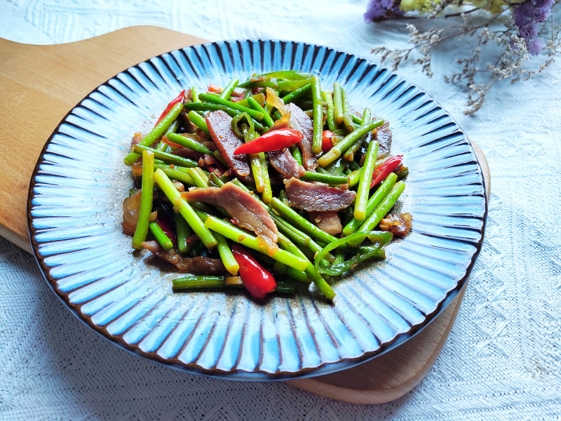 12:起锅装盘。蒜条脆爽,腊肉咸香,有点辣,但是很下饭。