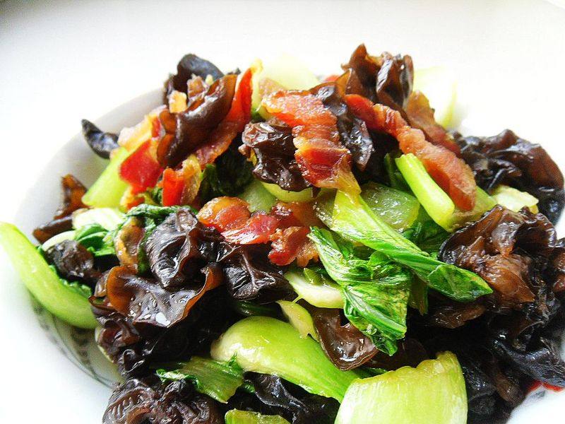 腊肉100克;油菜300克;泡发黑木耳200克;