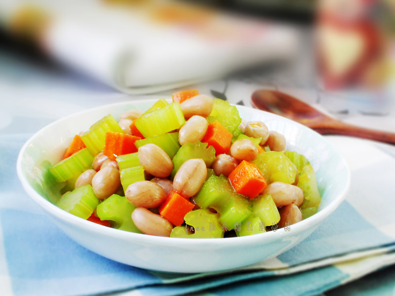 7:西芹、花生、胡萝卜一起入大碗中,倒入料汁拌匀即可。